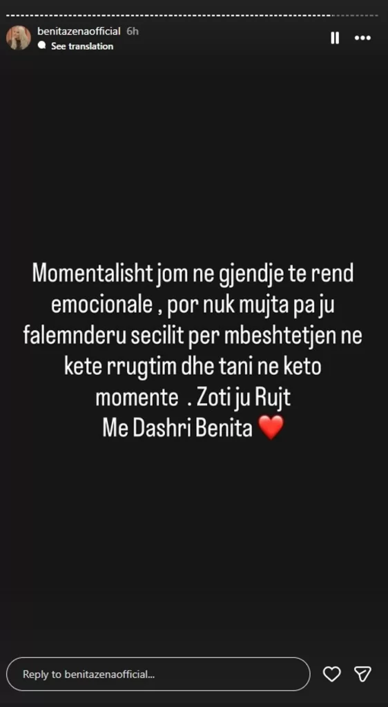 “Momentalisht jam në gjendje të rëndë emocionale, por nuk munda pa ju falënderuar secilin për mbështetjen në këtë rrugëtim dhe tani në këto momente. Zoti ju ruajtë”, ka shkruar ajo.