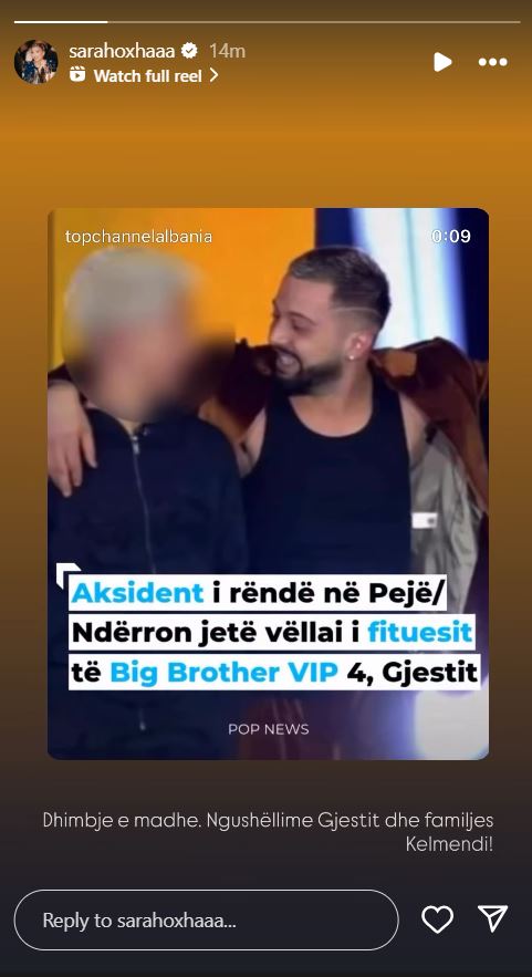 Producentja e Big Brother VIP Albania, Sara Hoxha ka reaguar për ngjarjen tragjike që ka ndodhur sot në familjen Besart Kelmendit i njohur si Gjesti.
