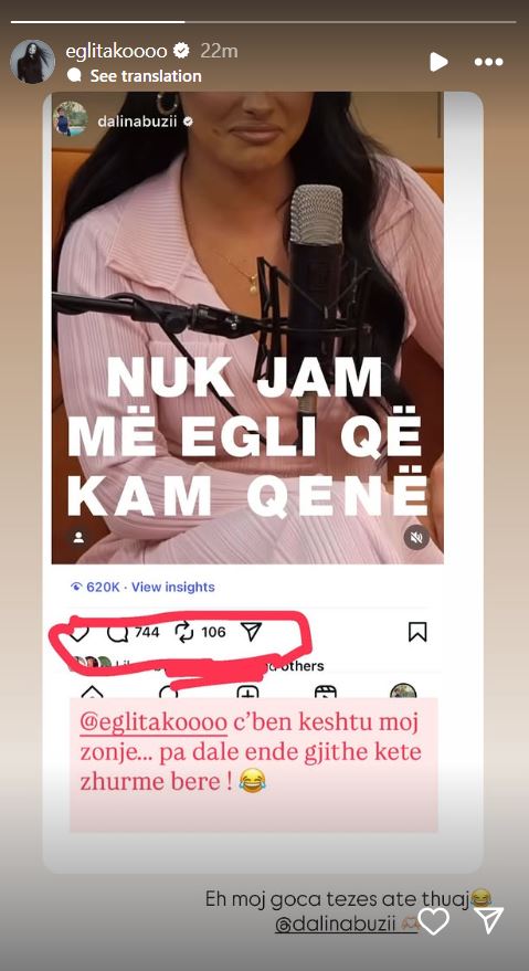 Dalina ka etiketuar Eglin në një postim ku shkruan: “Ç’bën kështu moj zonjë… pa dalë ende gjithë këtë zhurmë bëre”.