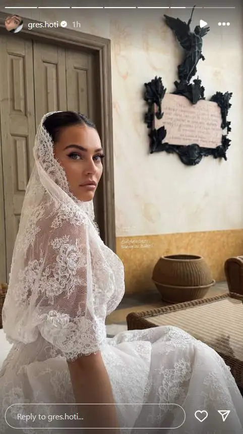 Në disa foto që kanë qarkulluar me shpejtësi, Gresa shfaqet e veshur si nuse, me fustan të bardhë, vello elegante dhe një pamje plot shkëlqim.