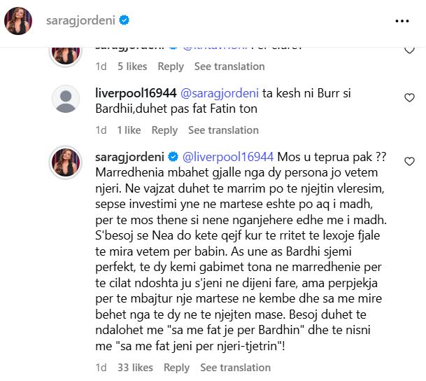 Ndërkohë që Sara i është përgjigjur: “Mos u teprua pak ?? Marredhenia mbahet gjalle nga dy persona jo vetem njeri. Ne vajzat duhet te marrim po te njejtin vleresim, sepse investimi yne ne martese eshte po aq i madh, per te mos thene si nene nganjehere edhe me i madh. S’besoj se Nea do kete qejf kur te rritet te lexoje fjale te mira vetem per babin. As une as Bardhi sjemi perfekt, te dy kemi gabimet tona ne marredhenie per te cilat ndoshta ju s’jeni ne dijeni fare, ama perpjekja per te mbajtur nje martese ne kembe dhe sa me mire behet nga te dy ne te njejten mase. Besoj duhet te ndalohet me “sa me fat je per Bardhin” dhe te nisni me “sa me fat jeni per njeri-tjetrin”!”.
