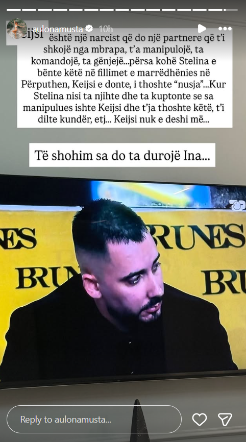 “Keijsi është një narcist që do një partnere që t’i shkojë nga mbrapa, t’a manipulojë, ta komandojë, ta gënjejë…përsa kohë Stelina e bënte këtë në fillimet e marrëdhënies në Përputhen, Keijsi e donte, i thoshte “nusja”…Kur Stelina nisi ta njihte dhe ta kuptonte se sa manipulues ishte Keijsi dhe t’ja thoshte këtë, t’i dilte kundër, etj… Keijsi nuk e deshi më… Të shohim sa do ta durojë Ina…”, ka shkruar ajo në Instastory sa i përket Keijsit.