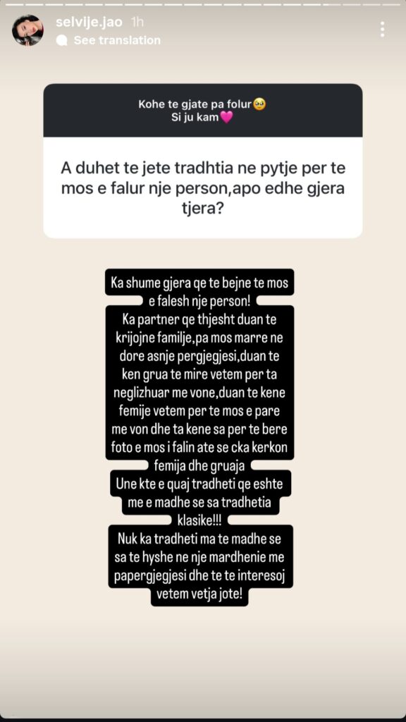“Ka partnerë që duan vetëm të krijojnë familje pa marrë asnjë përgjegjësi, duan një grua të mirë vetëm për ta neglizhuar më vonë, duan fëmijë vetëm për t’u bërë foto e jo për t’i dhënë atë që i takon fëmijës dhe gruas. Këtë e quaj tradhti më të madhe sesa tradhtia klasike”, iu përgjigj ajo ndjekësit.