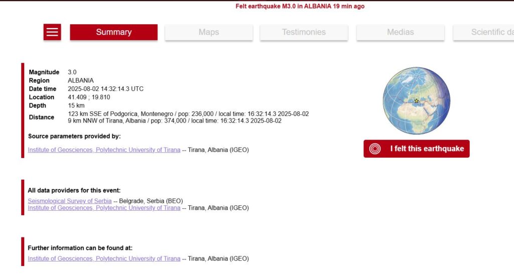 Lëkundjet ishin me magnitudë 3 ballë, ndërsa thellësia fokale ishte 15 kilometra.