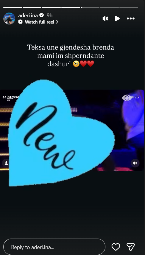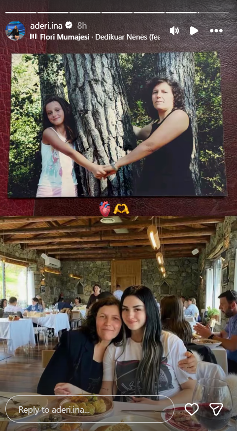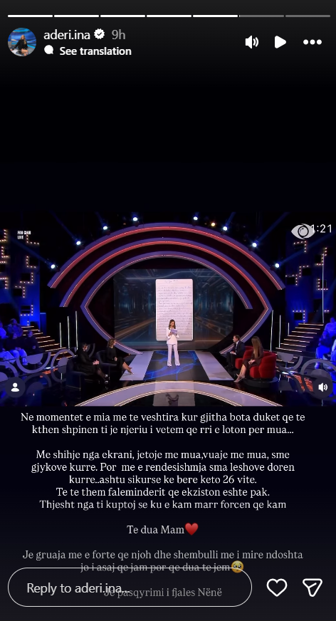 Ndërkohë që në një tjetër shkruan: “Në momentet e mia më të vështira, kur gjithë bota duket që të kthen shpinën ti je njeriu i vetëm që rri e loton për mua… Më shihje nga ekrani, jetoje me mua, vuaje me mua, s’më gjykove kurrë. Por më e rëndësishmja s’ma lëshove dorën kurrë.. ashtu sikurse ke bërë këto 26 vite. Të të them faleminderit që ekziston është pak. Thjesht nga ti kuptoj se ku e kam marrë forcën që kam. Të dua Mam. Je gruaja më e fortë që njoh dhe shembulli më i mirë ndoshta, jo i asaj që jam, por që dua të jem. Je pasqyrimi i fjalës nënë.”