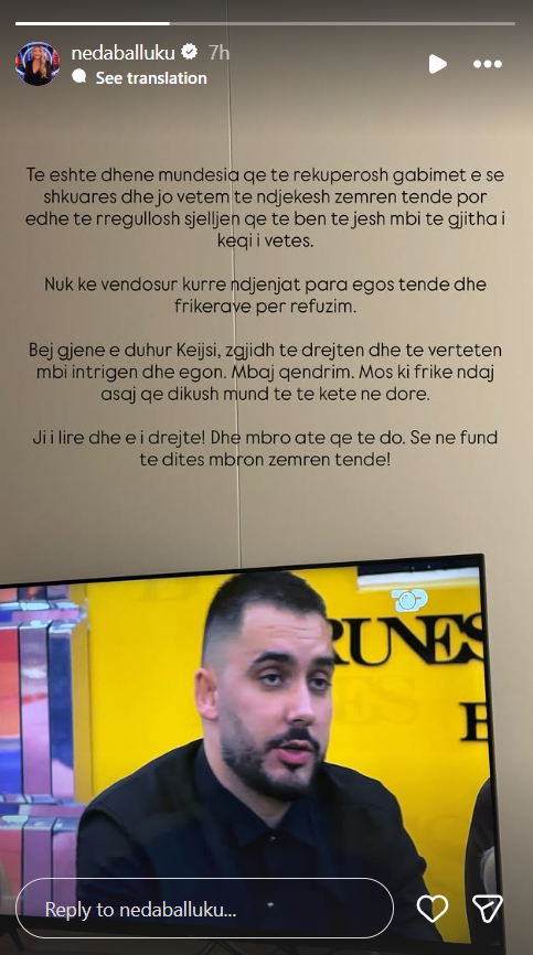 Ji i lire dhe e i drejte! Dhe mbro ate qe te do. Se ne fund te dites mbron zemren tende!”, shkruan Neda.