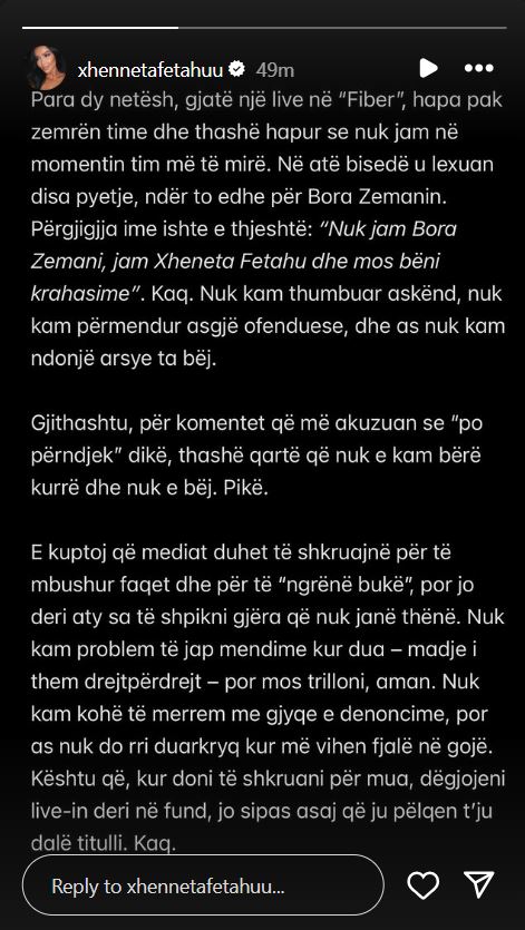 “Para dy netësh, gjatë një live në “Fiber”, hapa pak zemrën time dhe thashë hapur se nuk jam në momentin tim më të mirë. Në atë bisedë u lexuan disa pyetje, ndër to edhe për Bora Zemanin. Përgjigjja ime ishte e thjeshtë: “Nuk jam Bora Zemani, jam Xheneta Fetahu dhe mos bëni krahasime”. Kaq. Nuk kam thumbuar askënd, nuk kam përmendur asgjë ofenduese, dhe as nuk kam ndonjë arsye ta bëj. Gjithashtu, për komentet që më akuzuan se “po përndjek” dikë, thashë qartë që nuk e kam bërë kurrë dhe nuk e bëj. Pikë. E kuptoj që mediat duhet të shkruajnë për të mbushur faqet dhe për të “ngrënë bukë”, por jo deri aty sa të shpikni gjëra që nuk janë thënë. Nuk kam problem të jap mendime kur dua – madje i them drejtpërdrejt – por mos trilloni, aman. Nuk kam kohë të merrem me gjyqe e denoncime, por as nuk do rri duarkryq kur më vihen fjalë në gojë. Kështu që, kur doni të shkruani për mua, dëgjojeni live-in deri në fund, jo sipas asaj që ju pëlqen t’ju dalë titulli. Kaq”, shkruan Xheneta.