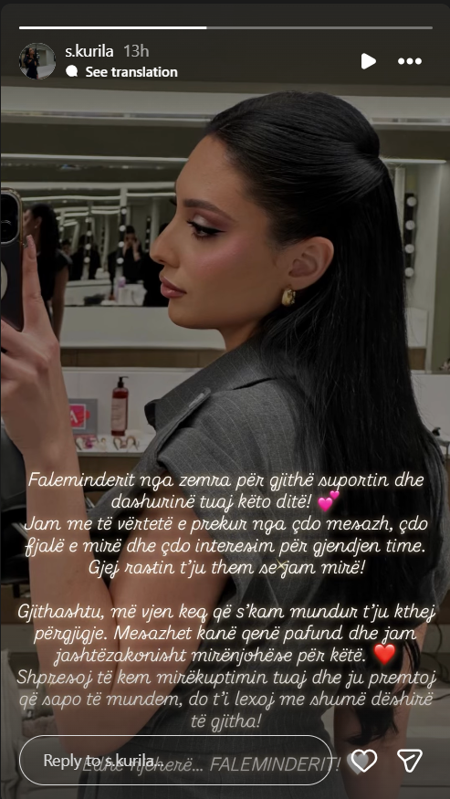 “Faleminderit nga zemra për gjithë suportin dhe dashurinë tuaj këto ditë. Jam me të vërtetë e prekur nga çdo mesazh, çdo fjalë e mirë dhe çdo interesim për gjendjen time. Gjej rastin t’ju them se jam mirë! Gjithashtu, më vjen keq që s’kam mundur t’ju kthej përgjigje. Mesazhet kanë qenë pafund dhe jam jashtëzakonisht mirënjohëse për këtë. Shpresoj të kem mirëkuptimin tuaj dhe ju premtoj që sapo të mundem, do t’i lexoj me shumë dëshirë të gjitha. Edhe njëherë…Faleminderit!”, shkruan Stelina në Instastory.