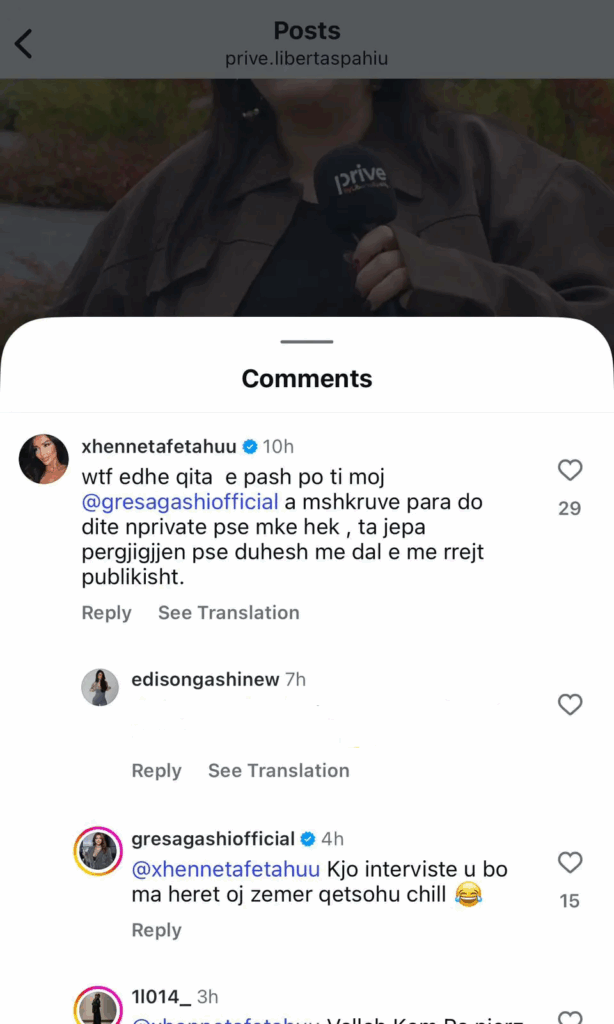 “Wtf, edhe qita e pash! Po ti moj Gresa, a m’shkruve para do dite pse t’kom hek? T’kom dhanë përgjigjen, pse duhesh me dalë me rrejt publikisht?”, ka shkruar Xheneta hapur në komente.