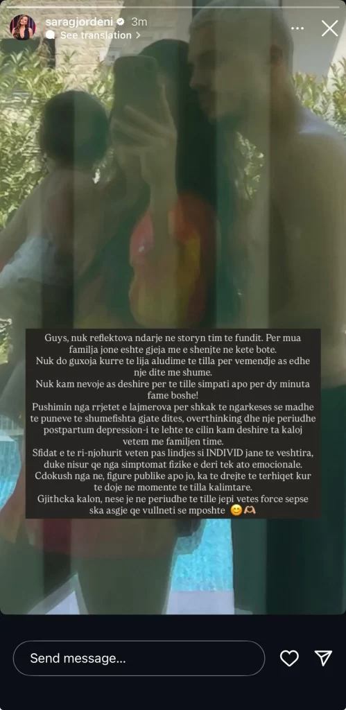 “Guys, nuk reflektova ndarje ne storyn tim te fundit. Për mua familja jonë është gjëja më e shenjtë në këtë botë. Nuk do guxoja kurrë të lija aludime të tilla për vëmendje as edhe një ditë më shumë. Nuk kam nevojë as dëshirë për të tillë simpati apo për dy minuta famë boshe! Pushimin nga rrjetet e lajmërova për shkak të ngarkesës së madhe të punëve të shumta gjatë ditës, overthinking dhe një periudhe postpartum depression-i të lehtë të cilin kam dëshirë ta kaloj vetëm me familjen time. Sfidat e të ri-njohurit veten pas lindjes si individ janë të vështira, duke nisur që nga simptomat fizike e deri tek ato emocionale. Çdokush nga ne, figurë publike apo jo, ka të drejtë të tërhiqet kur të dojë në momente të tilla kalimtare. Gjithçka kalon, nëse je në periudhë të tillë jepi vetes forcë sepse s’ka asgjë që vullneti s’e mposht.“, shkruan Sara.