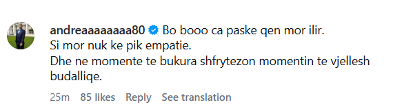“Bo booo ca paske qen mor ilir. Si mor nuk ke pik empatie. Dhe ne momente te bukura shfrytezon momentin te vjellesh budalliqe.”, shkruan Andrea.